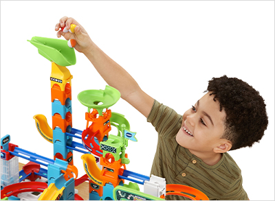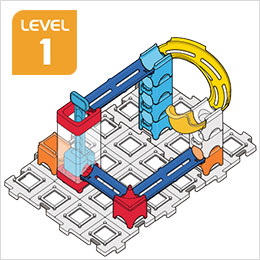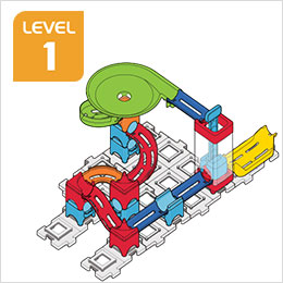 Complete the construction set as illustrated, then place 4 marbles in the Starting Gate to begin. Complete the construction set as illustrated, then drop a few marbles into the Green Fill & Tip Barrel and guess which marble will finish first. Then, tip the Green Fill & Tip Barrel over and see what happens. Did you guess right?