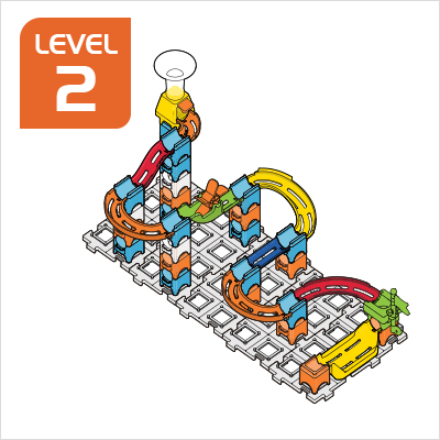 Complete the construction set as illustrated, then drop a marble down the clear funnel to begin. -