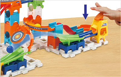 The cannon launcher shoots a marble directly upward to the inverted catcher. Explore different ways of constructing the track to change the height of this catcher. Apply different amounts of force to see if the marble successfully launches into the target.- Does it take a stronger or weaker press to send the marble to a shorter height?