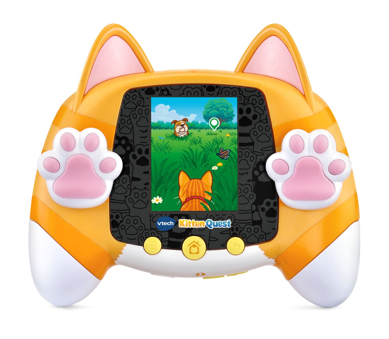 Discover a kitty’s purr-fect world in two amazing ways! Explore more than 30 meow-velous games and activities by adopting a kitten and playing as the virtual pet with this handheld game. Choose from eight different kittens to feed, cuddle and talk to. Collect coins for toys, beds and decorations. Includes a certificate of adoption and kitten care chart to enhance pretend play. Explore the world from the kitten’s perspective to find missing puzzle pieces, discover treasures and play arcade-style games with lots of cat-itude. Test memory too with playful search activities. Your kitty adventures start now! Intended for ages 4+ years. Requires 4 AA batteries. Batteries included for demo purposes only. New batteries recommended for regular use.