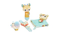 Bring together the land and the sea with this baby bundle set that includes four animals and five items for curious cuties to cuddle, chat and create music with here, there or anywhere! Go on a sensory safari with the elephant’s crinkly ears, soft head, arms and legs, all while rattling beads and listening to catchy tunes from the big heart button. Take a dive into musical expression on the whale piano with four keys that introduce colors and numbers and let budding musicians compose their own songs. Call friends, listen to messages and explore numbers and colors by pressing squishy buttons on the soft hippo phone. Starfish maracas are simple to use, creating rhythmic rattling beats with every shake. Each animal can be easily toted around for on-the-go play by tossing them into a diaper bag or using the straps to attach them to strollers and carriers. Let’s play! Intended for ages 3+ months. Requires 5 AAA batteries. Batteries included for demo purposes only. New batteries recommended for regular use.